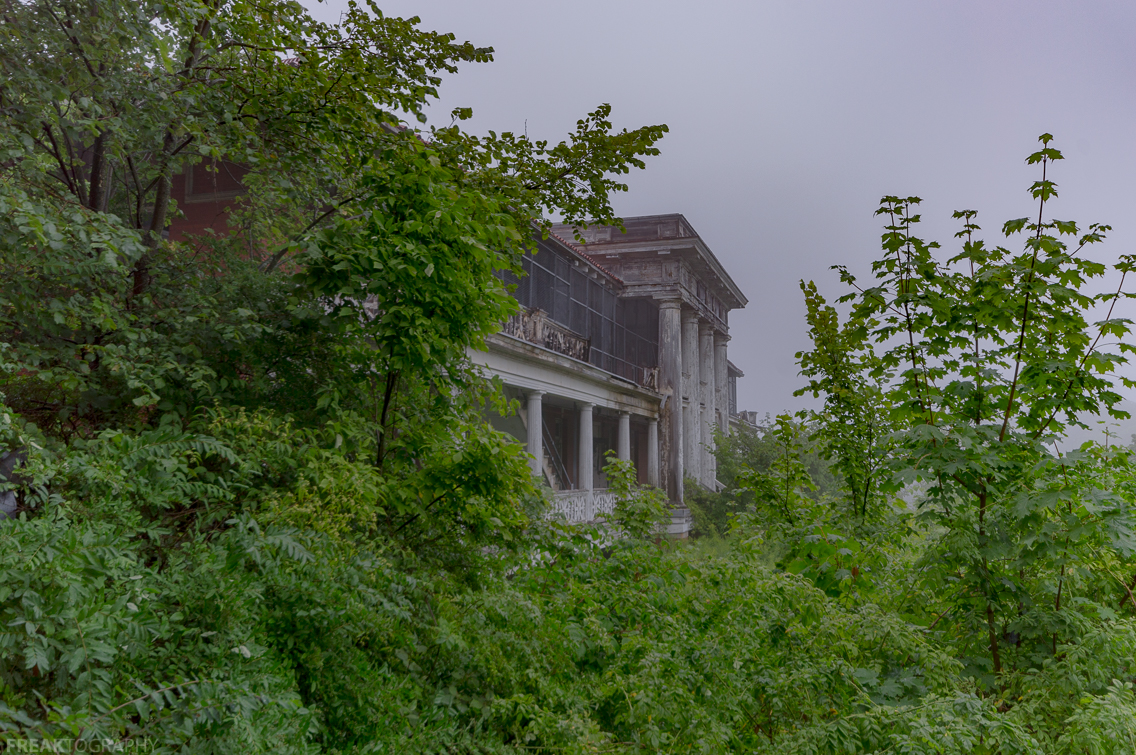 Exterior photograph of an Abandoned Tuberculosis Hospital on a foggy morning in New York State OC - 1136 × 755.